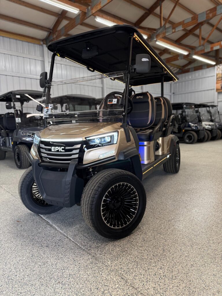 The brand new Epic E60FX is the most in-demand golf cart that is taking the industry by storm! This ultimate street-legal 6-seater golf cart is equipped with premium 14” street-ready tires that provide an ultra smooth ride. Play the tunes loud on its superior built-in marine-grade sound system, and turn heads with the stunning accent lighting adorned throughout. This Epic E60FX golf cart comes in six stylish colors and two height options to cater to your golf cart…