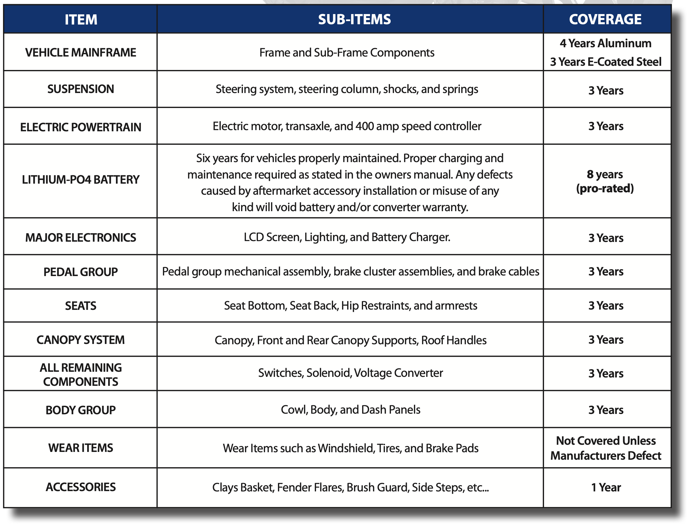 This limited warranty covers material, workmanship and repair labor cost as to those items specifically listed below for the periods specified. Such repair labor shall be performed only by Sierra LSV, its Authorized Dealers or Distributors, or a service agency approved by Sierra LSV. For repairs made by qualified technicians other than Sierra LSV’s factory technicians or an Authorized Dealer or Distributor, Sierra LSV will provide only the replacement parts or components.